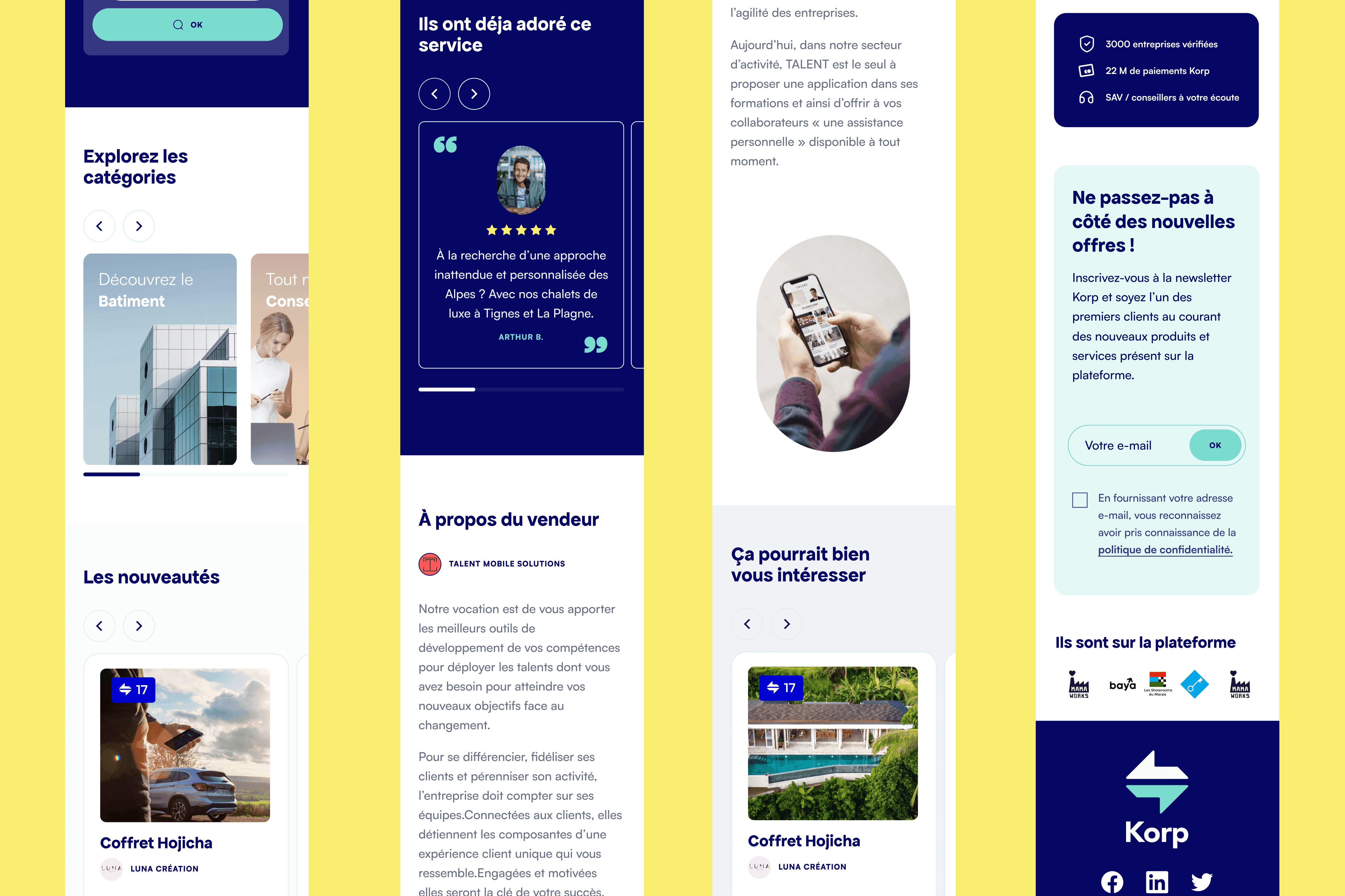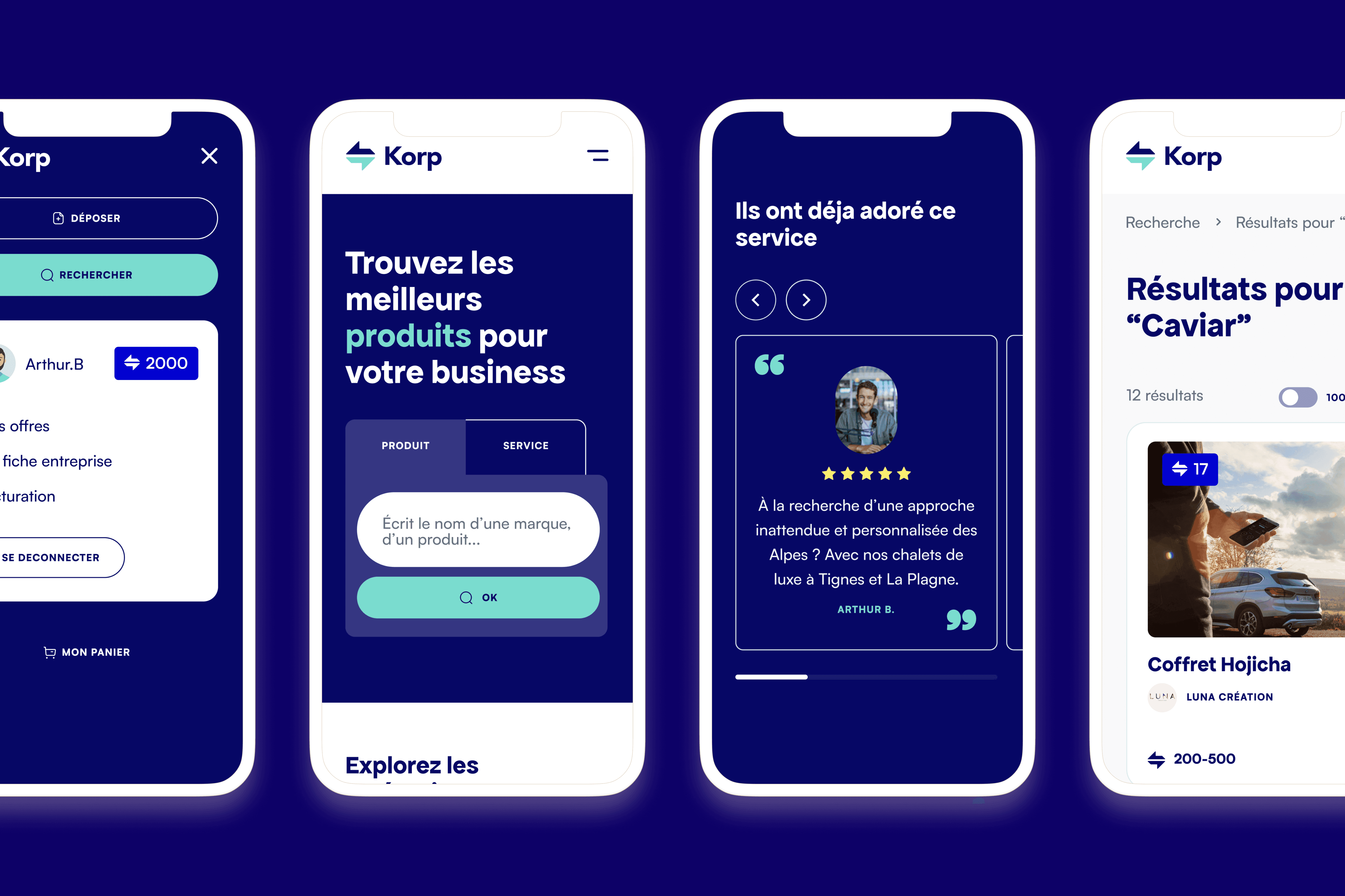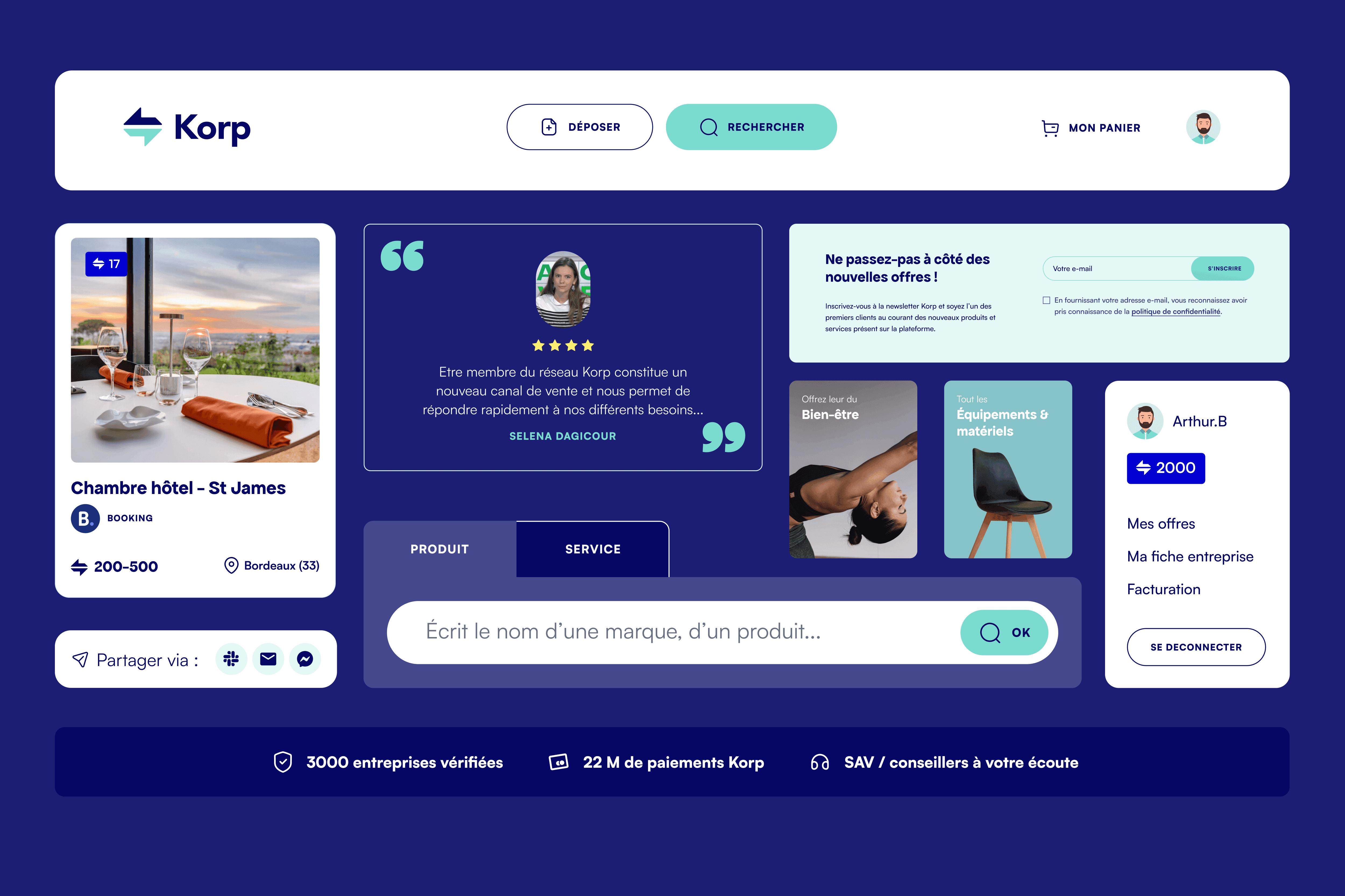 J'ai collaboré avec Korp pour améliorer leur marque en développant une approche de design distinctive et épurée qui les distingue de leurs concurrents et renforce leur image professionnelle, tout en restant fidèle à leur identité initiale. Nous avons également travaillé ensemble à la mise en œuvre de cette identité de marque dans toute l'expérience Korp, de l'intégration à la place de marché, créant une plus grande cohérence et adaptabilité pour leurs utilisateurs cibles.