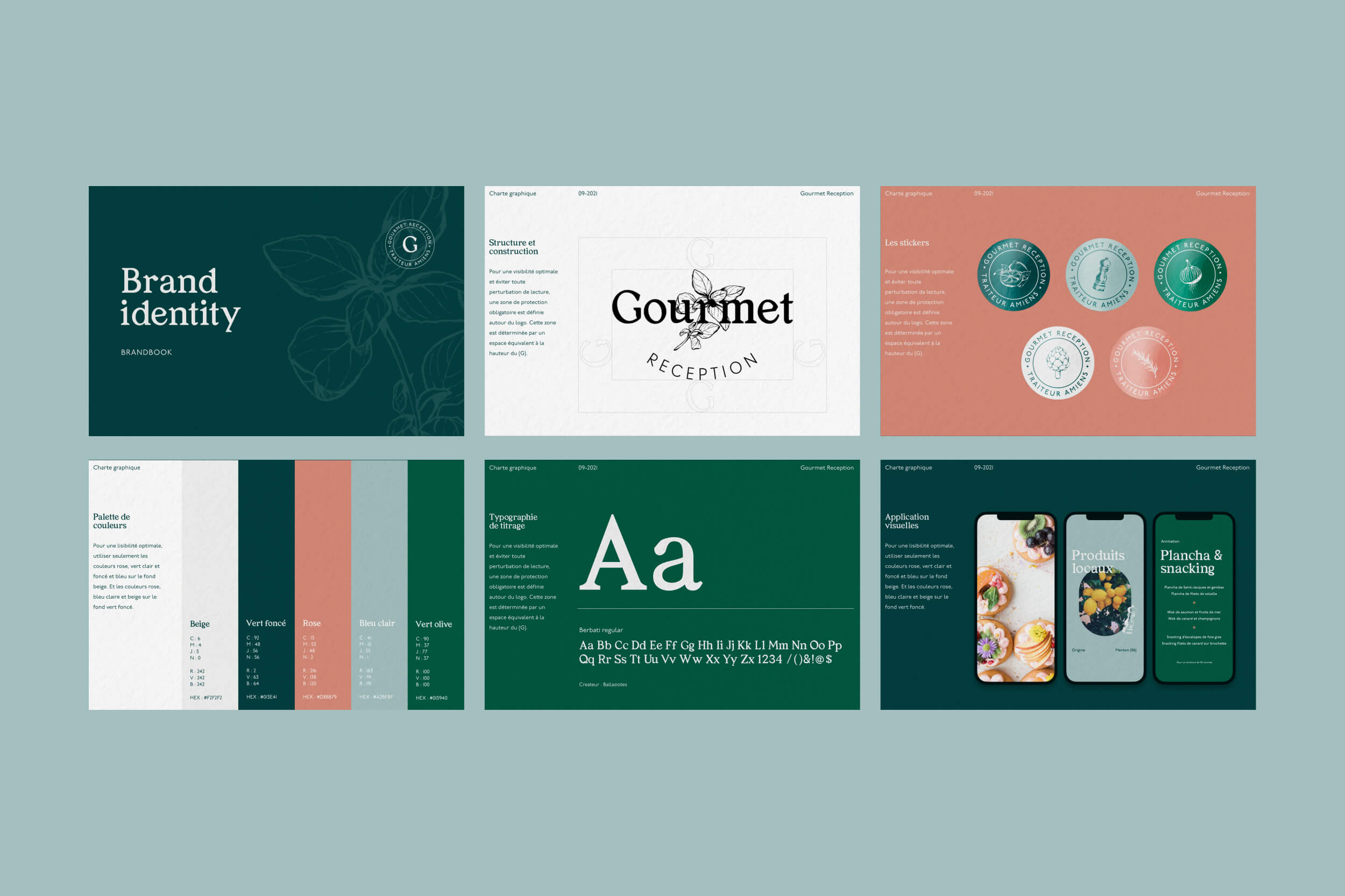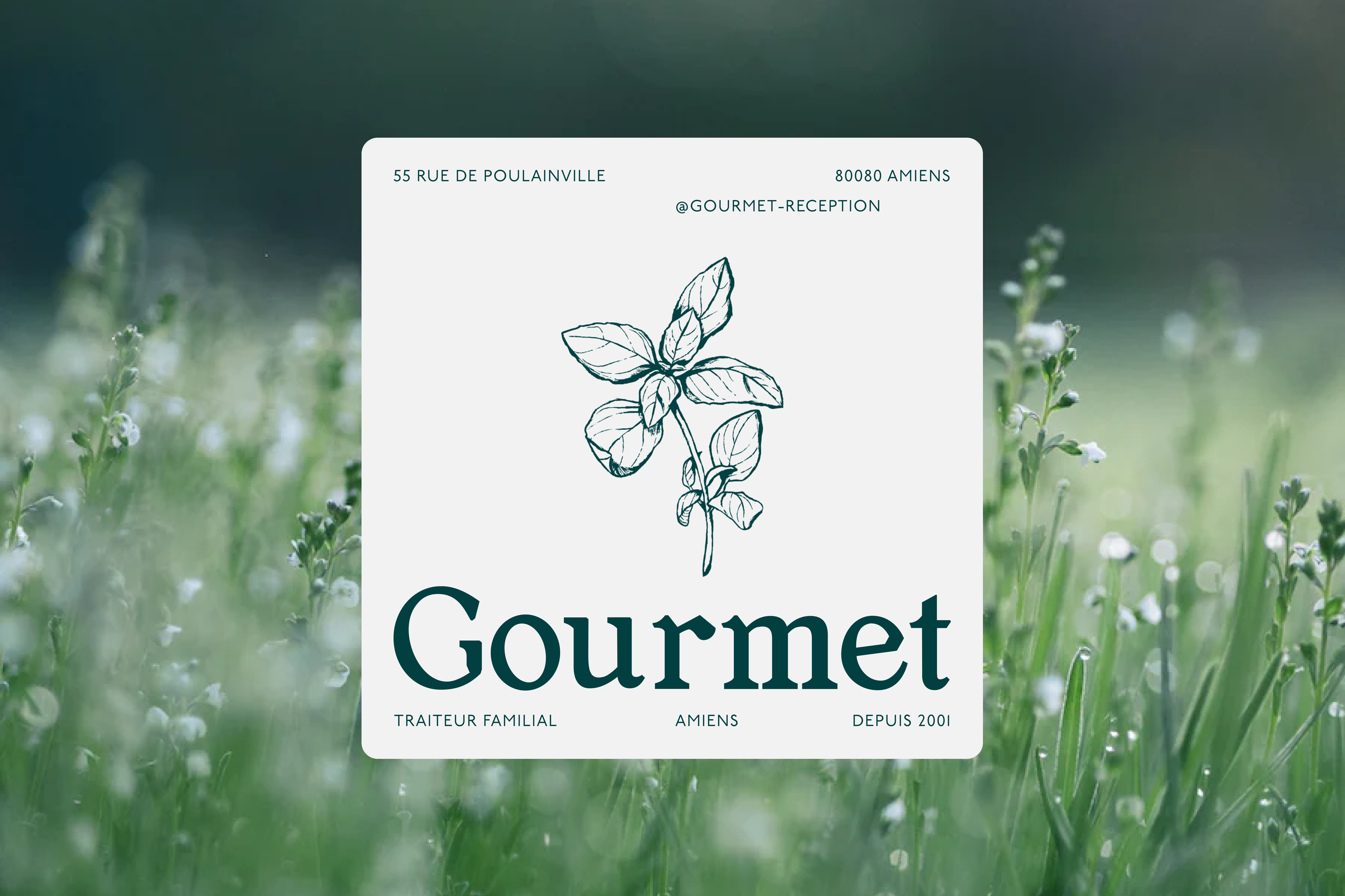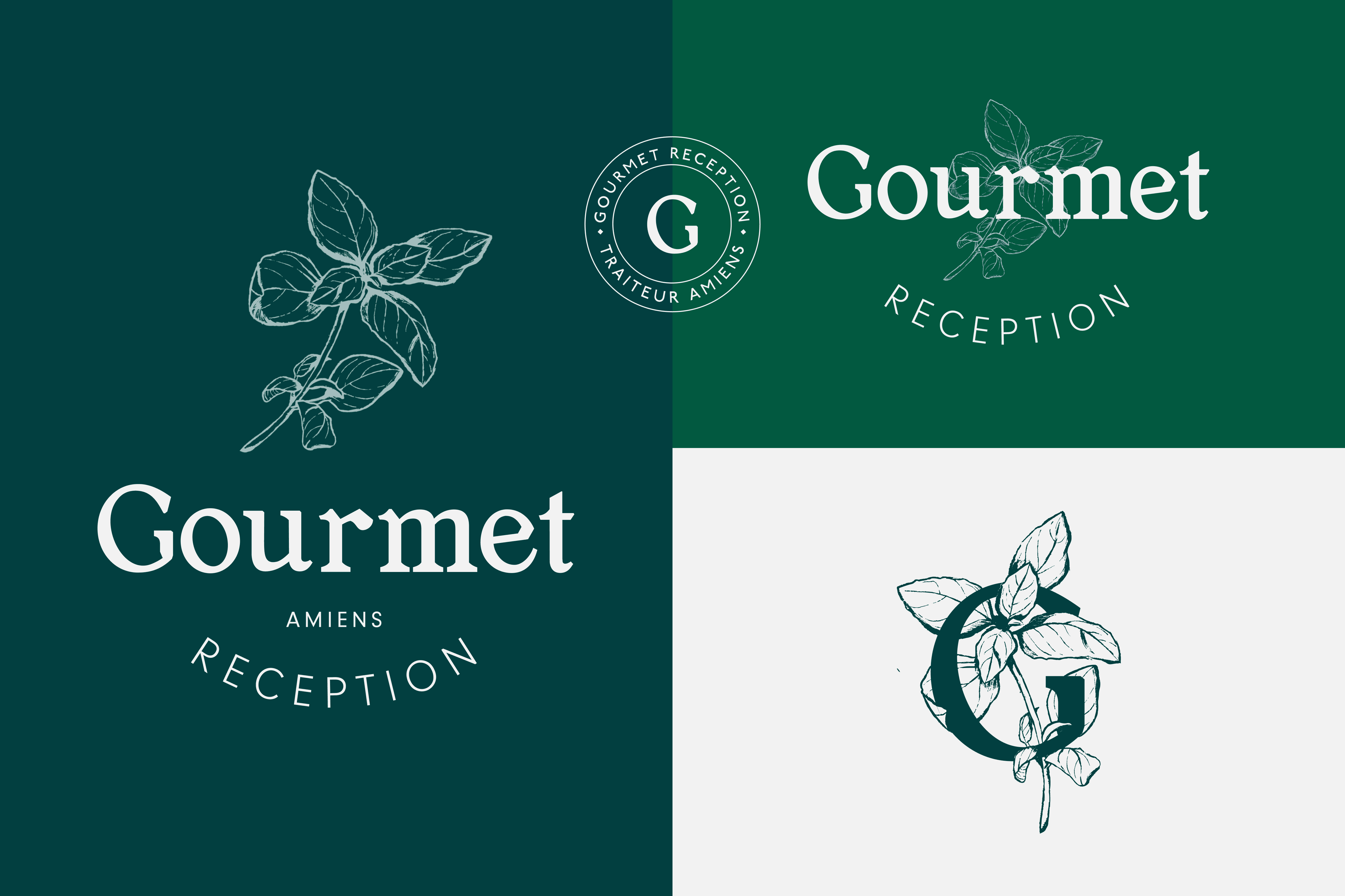 To celebrate their 20th year, they decided to freshen up the brand identity and give it is uniqueness. I was commissioned to rebrand Gourmet Réception, emphasizing their heritage, products, and nature. Inspired by classic logos, we designed a versatile logo featuring the family name and a basil leaf. The chosen typography, Berbati serif, adds authenticity and a vintage touch. To evoke craftsmanship and fresh ingredients, we created handmade charcoal illustrations. Soft and enveloping colors were selected to bring modernity while maintaining a timeless simplicity.
